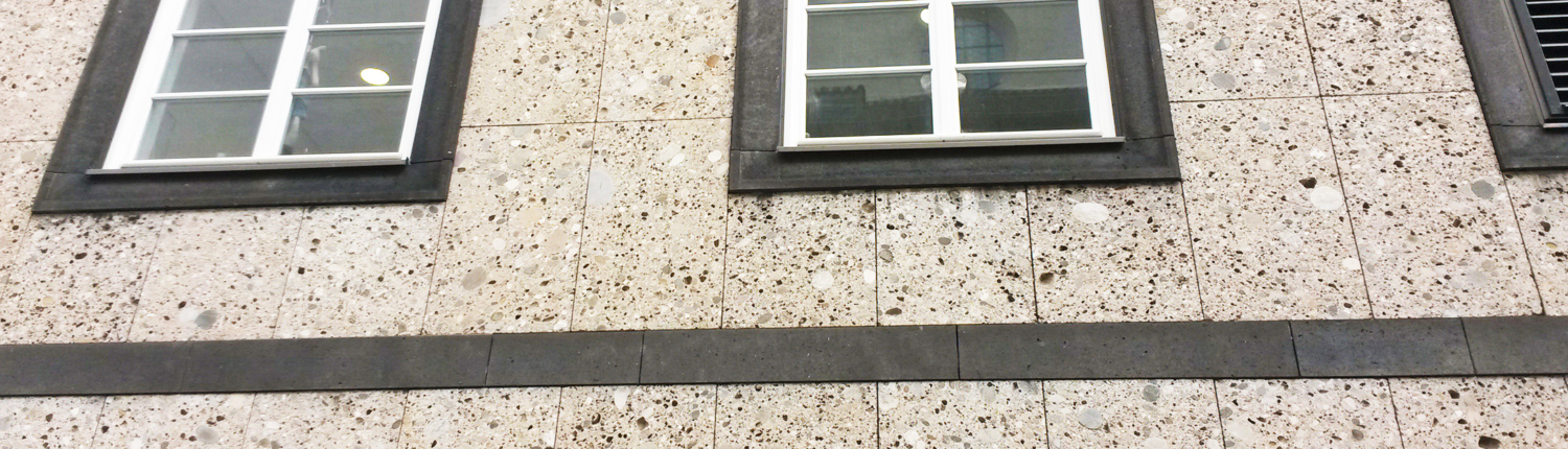 Der Naturstein Nagelfluh überzeugt als Sockel- und Fassadenverkleidung. Er wird verwendet für Böden, Fensterbänke, Bodenplatten, Treppen, Säulen und Türumrahmungen.
